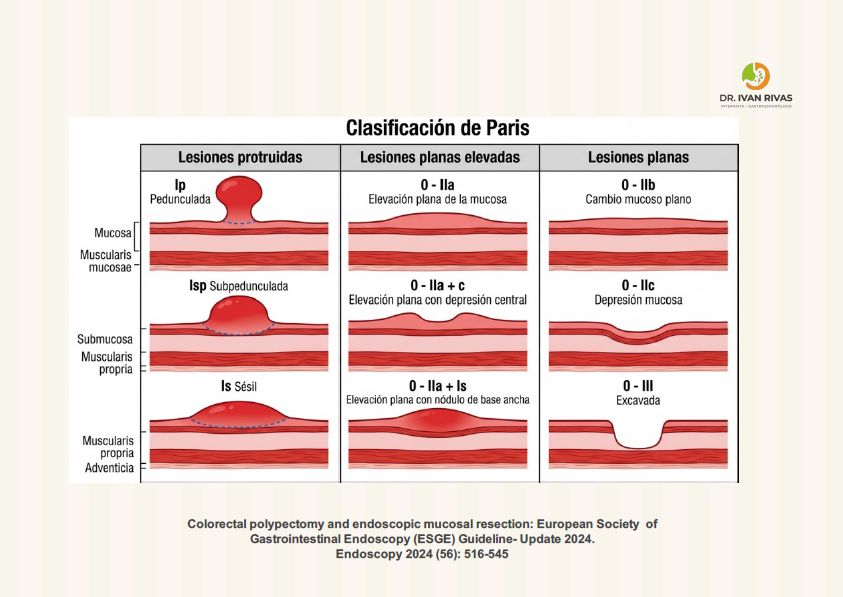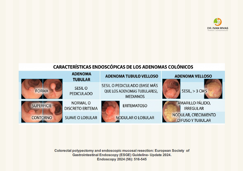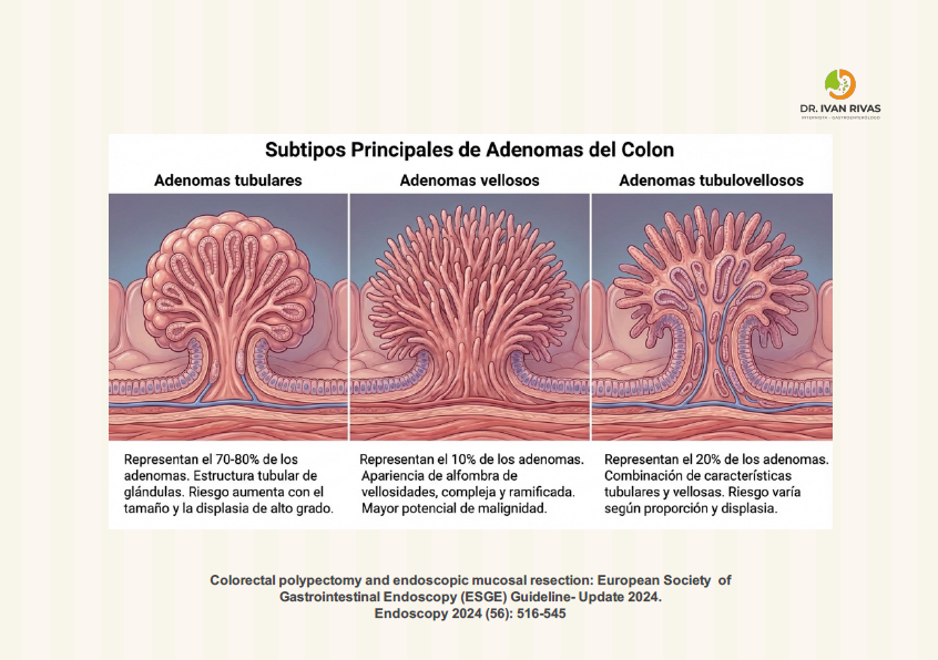 Morfología según clasificación de París: Los adenomas con mayor componente velloso tienden a presentarse como lesiones no pediculadas (sésiles o planas, tipos 0-Is o 0-IIa), mientras que los adenomas tubulares predominan en formas pediculadas (0-Ip)