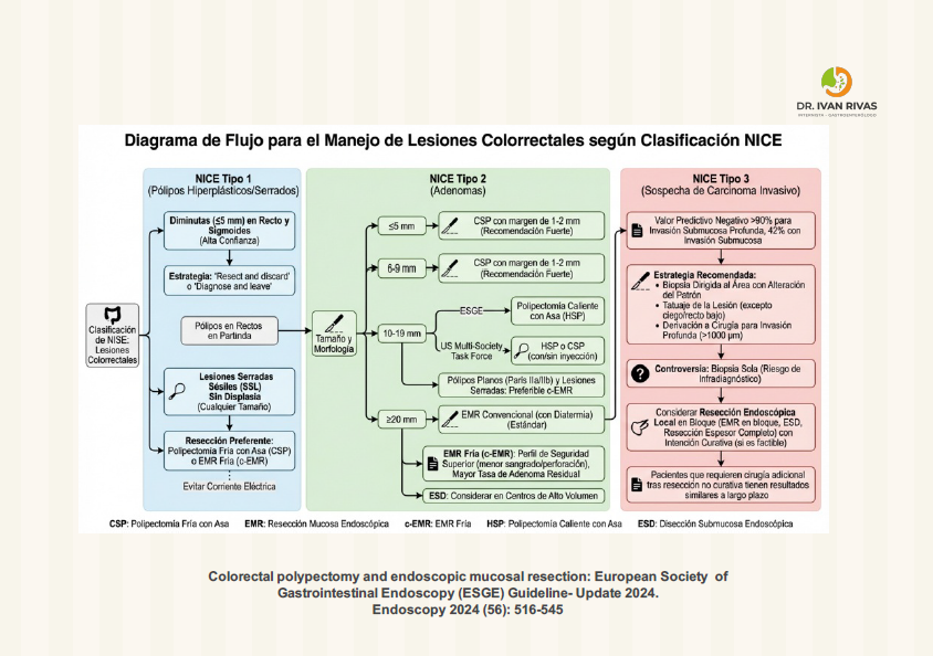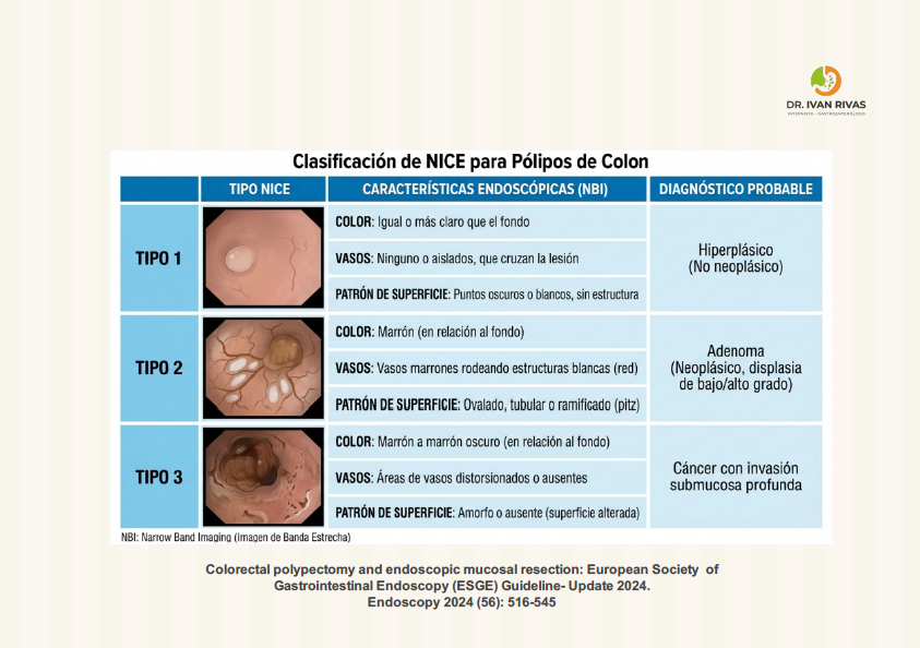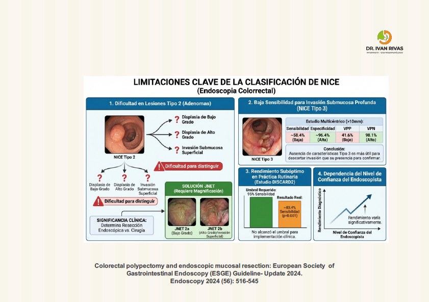 La clasificación NICE (NBI International Colorectal Endoscopic) es un sistema validado para la caracterización óptica de pólipos colorrectales mediante NBI, pero presenta varias limitaciones clínicamente relevantes que han sido reconocidas en las guías de las principales sociedades gastroenterológicas.