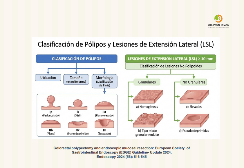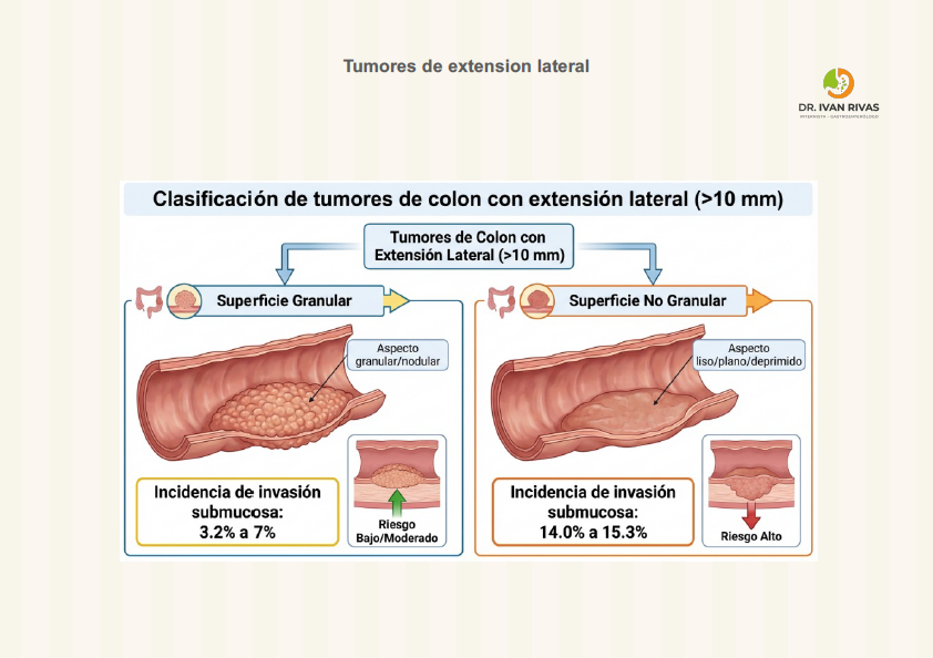 Las lesiones de extensión lateral (LST, laterally spreading tumors) son pólipos colorrectales ≥10 mm con eje vertical bajo que se extienden lateralmente a lo largo de la pared colónica, clasificándose en dos tipos principales con subtipos específicos que predicen el riesgo de invasión submucosa y guían la estrategia de resección.