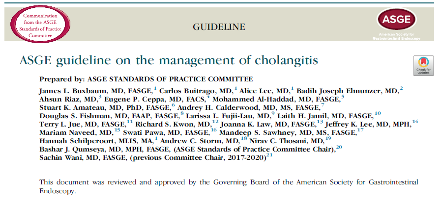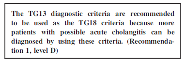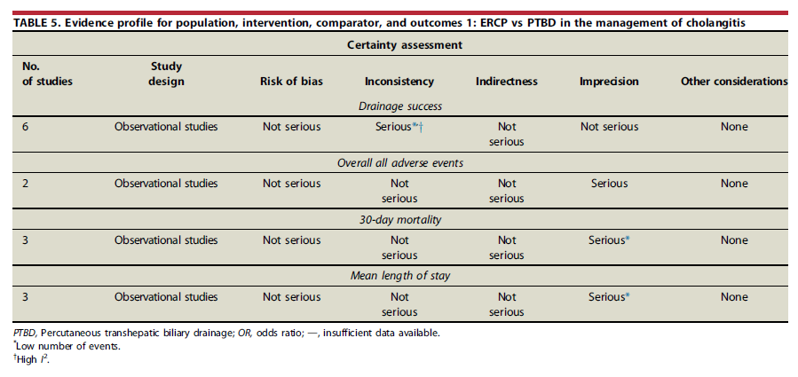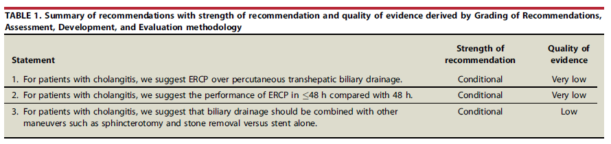 Recomendación 1: para pacientes con colangitis se recomienda CPRE en lugar de drenaje transcutáneo de la vía biliar (Recomendación Condicional, baja calidad de evidencia)