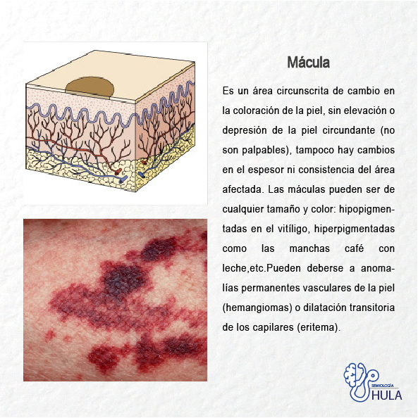 Mácula: es un área circunscrita de cambio en la coloración de la piel, sin elevación o depresión de la piel circundante ( no son palpables), tampoco hay cambios en el espesor ni consistencia del área afectada. Las máculas pueden ser de cualquier tamaño y de cualquier color: hipopigmentadas en el vitíligo, hiperpigmentadas como las manchas café con leche,etc. Pueden deberse a anomalías permanentes vasculares de la piel como en los hemangiomas o dilatación transitoria de los capilares como el eritema.