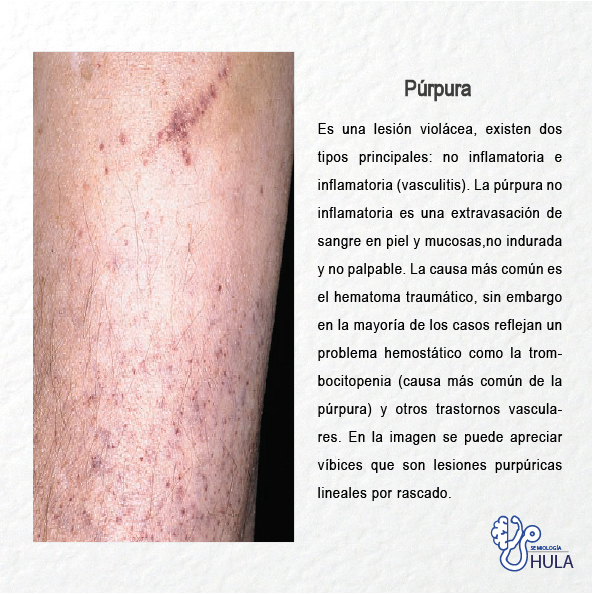 Púrpura: manchas por extravasación sanguínea de color morado o amarillo verdoso, es mayor de 1 centímetro. Ejemplos: la púrpura senil y la vasculitis.