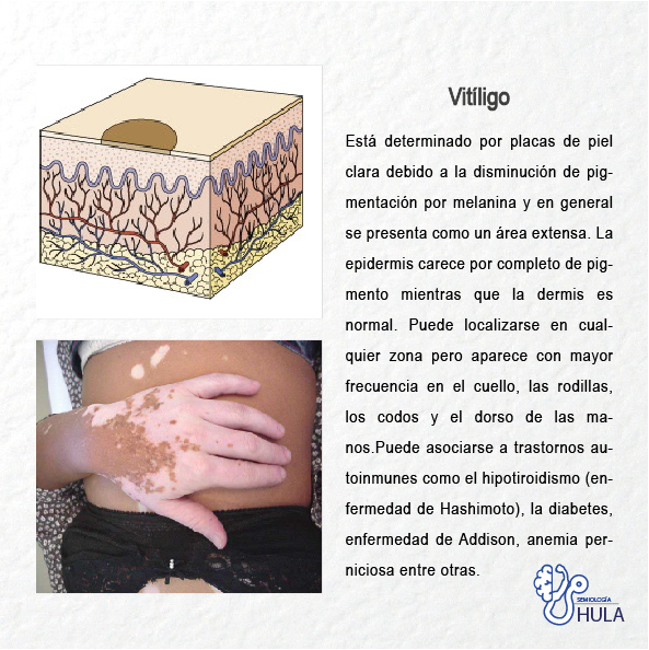 - Hipocrómicas (lepra). Las hipocrómicas localizadas se denominan Eczemátide acromiante y las generalizadas se producen en el albinismo.